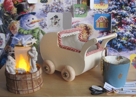 11: Naulakko ja hengari Ninnalta, 12: ompelukori ja langat Marjalta, 14: pannumyssy ja kuparipannu, jossa avautuva nokkaläppä ja kansi Railalta, 15 Tittalta: postimiehen laukku, jossa kortteja, postimerkkiarkki ja evässuklaalevy sisällä, 16 Gittalta: kitti ruukkuineen, josta voi askarrella esim. joulutähden.